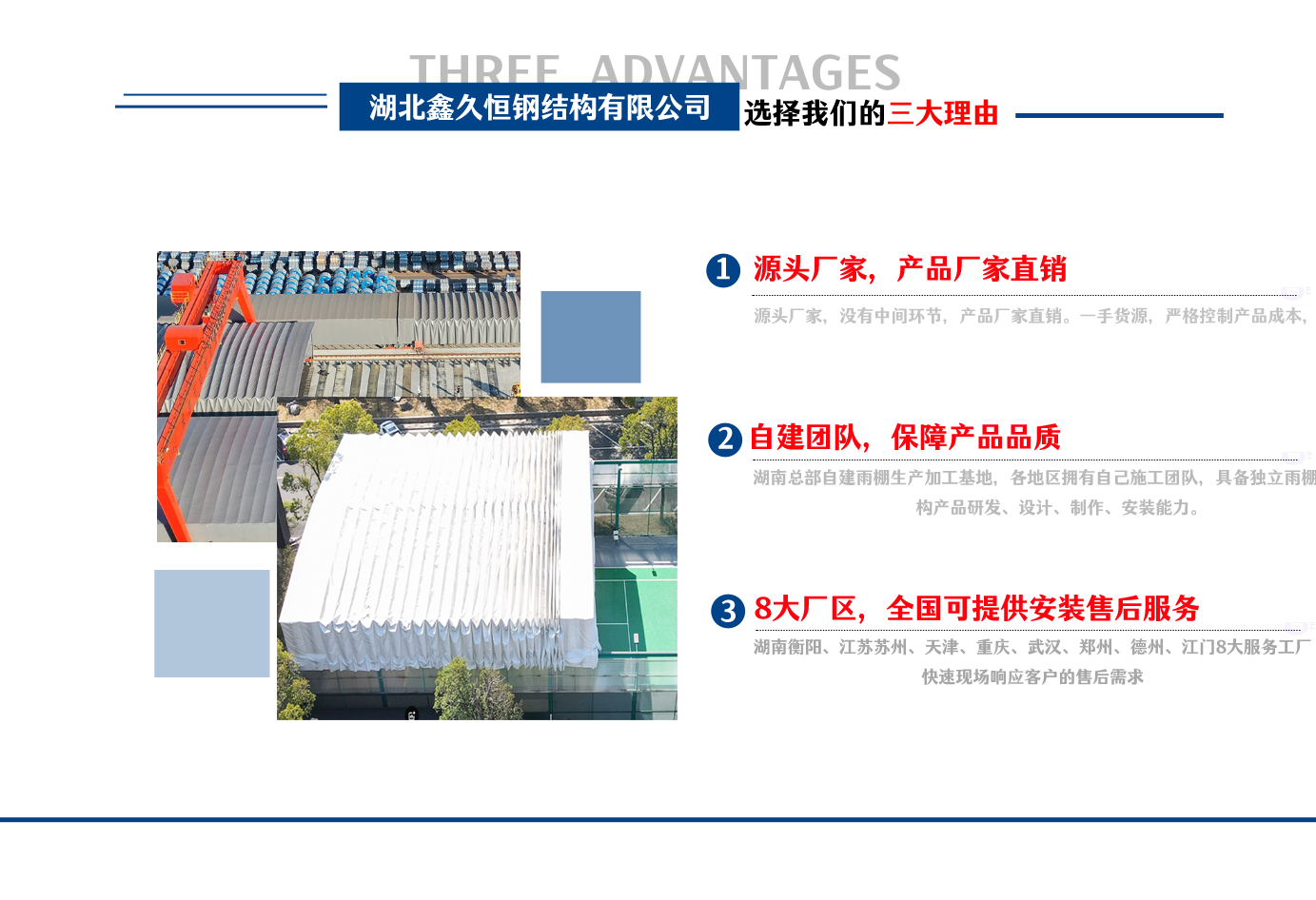 湖北鑫久恒鋼結(jié)構(gòu)有限公司是一家電動(dòng)雨棚、膜結(jié)構(gòu)車棚研發(fā),生產(chǎn)銷售,施工安裝于一體的專業(yè)鋼結(jié)構(gòu)科技公司,主要產(chǎn)品有伸縮雨棚,電動(dòng)雨棚,膜結(jié)構(gòu)車棚等。 湖南地區(qū)職員目前有80多人,占地面積20000平方米,廠房面積15600平方米,配備先進(jìn)的生產(chǎn)流水線,使每件品質(zhì)產(chǎn)品的堅(jiān)實(shí)基礎(chǔ)。 公司在蘇州、天津、重慶、武漢、德州、烏魯木齊、江門均設(shè)有服務(wù)工廠,總?cè)藛T共300多人,擁有專業(yè)的技術(shù)團(tuán)隊(duì),配備先進(jìn)的設(shè)備和流水線生產(chǎn),產(chǎn)能高,貨源充足,發(fā)貨速度快,服務(wù)區(qū)域廣。 移動(dòng)伸縮棚適用于通道臨時(shí)倉儲(chǔ)、戶外運(yùn)動(dòng)遮陽、污水池遮蓋、能源交通、熱力化工、礦山、船舶制造及市政建設(shè)、物流、碼頭等領(lǐng)域的構(gòu)件制作加工,成品半成品存放、倉庫、野外儀器設(shè)備操作用房等。尤其是對(duì)工廠發(fā)貨、倉儲(chǔ)臨時(shí)遮雨防嗮,梅雨期較長(zhǎng)、建設(shè)周期較短的工程施工等特別適用。還可根據(jù)用戶需求量身定制、適合企業(yè)所需不同款式的產(chǎn)品。 我公司堅(jiān)持“誠信社會(huì)為本,客戶滿意為榮”的經(jīng)營(yíng)理念,做到質(zhì)量把控,嚴(yán)格管理,精益求精,恪守承諾。使鑫久恒逐步走向成熟,其系統(tǒng)化、專業(yè)化日趨完善。以專業(yè)的技術(shù)、科學(xué)的管理,更高的產(chǎn)品質(zhì)量,優(yōu)良的企業(yè)信譽(yù),真誠的客戶服務(wù),靈活多樣的經(jīng)營(yíng)方式和務(wù)實(shí)創(chuàng)新的企業(yè)精神愿與社會(huì)各界攜手合作,為推動(dòng)智能鋼結(jié)構(gòu)建筑事業(yè)的發(fā)展而不斷努力。...